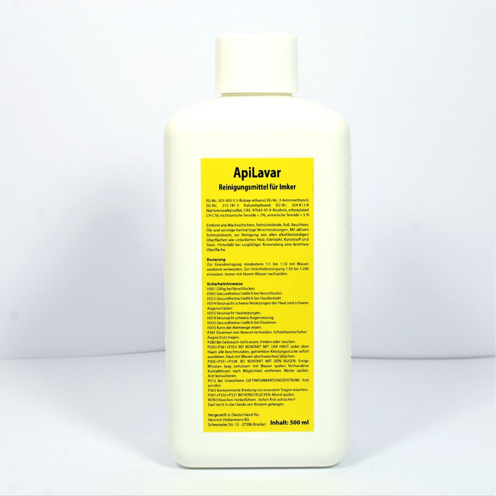 Reinigungsmittel für Imker, 500 ml, geeignet zum Entfernen von Kittharz und Reinigen von alkalibeständigen Oberflächen, wie z.B. unbehandeltem Holz, Edelstahl, Kunststoff oder Stein; EG-Nr.: 203-905-0 2-Butoxy-ethanol; EG-Nr.: 205-483-3 2-Aminoethanol; EG-Nr.: 215-181-3 Kaliumhydroxid; EG-Nr. 204-812-8 Natriumisoalkylsulfat; CAS: 97043-91-9 Alcohols, ethoxylated C9-16; nichtionische Tenside < 5 %, anionische Tenside < 5 %; Sicherheitshinweise: Darf nicht in die Hände von Kindern gelangen! Einatmen von Staub/Rauch/Gas/Nebel/Dampf/Aerosol vermeiden. Schutzhandschuhe/Schutzkleidung/Augenschutz/Gesichtsschutz tragen. Bei Gebrauch nicht essen, trinken oder rauchen. BEI KONTAKT MIT DER HAUT (oder dem Haar): Alle beschmutzten, getränkten Kleidungsstücke sofort ausziehen. Haut mit Wasser abwaschen/duschen. Kontaminierte Kleidung vor erneutem Tragen waschen. BEI KONTAKT MIT DEN AUGEN: Einige Minuten lang behutsam mit Wasser spülen. Vorhandene Kontaktlinsen nach Möglichkeit entfernen. Weiter spülen. Arzt konsultieren. Bei Unwohlsein GIFTINFORMATIONSZENTRUM / ARZT anrufen. BEI VERSCHLUCKEN: Mund spülen. KEIN Erbrechen herbeiführen. Reichlich Wasser trinken. Sofort Arzt aufsuchen! Vergiftungssymptome können erst nach vielen Stunden auftreten, deshalb ärztliche Überwachung mindestens 48 Stunden nach einem Unfall.