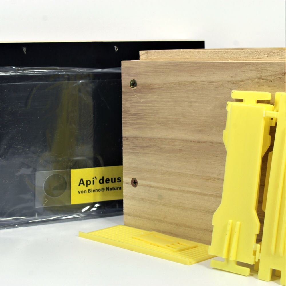 Hergestellt aus 20 mm starkem Massivholz; Bodenschieber, Fluglochkeil, herausnehmbarer Futtertrog, Lüftungs- und Absperrgitter, Abdeck-Fix, Deckel mit Dämmplatte, Drei kochfeste Rähmchen, Außenmaß 24 x 15 cm, Höhe 17 cm
